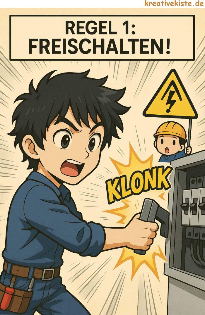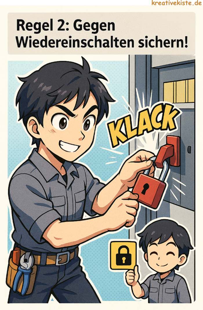 | 🔒 2. Gegen Wiedereinschalten sichern | Mit Schlössern, Sperren oder Schildern verhindern, dass jemand den Strom versehentlich wieder einschaltet. |