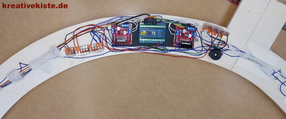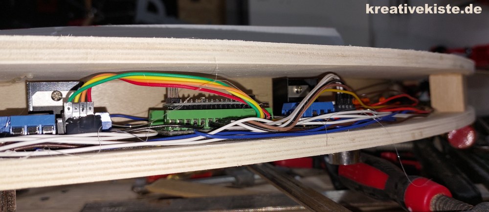 Nun die Schaltung auf dem unteren Brett aufbauen und testen. Später kommst du an die Schaltung durch eine Öffnung an der Rückseite noch hin aber jetzt ist es leichter einen Fehler zu finden und zu beheben.