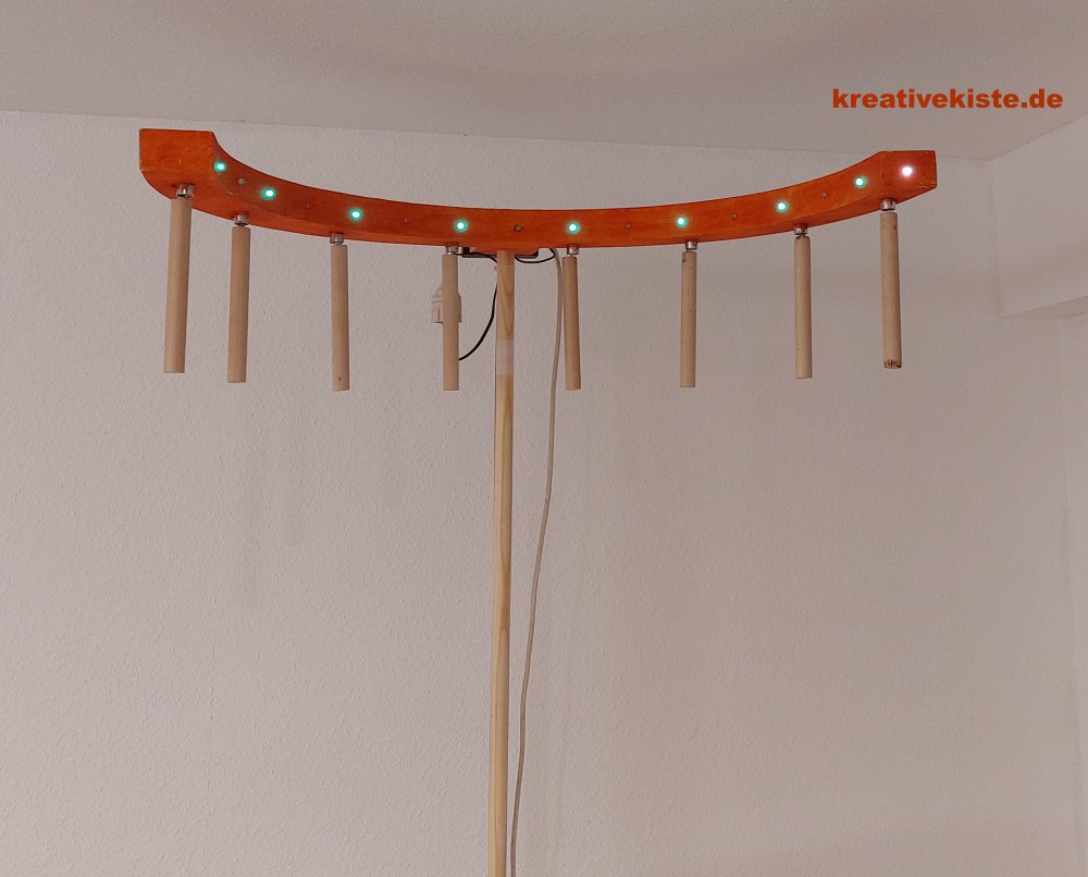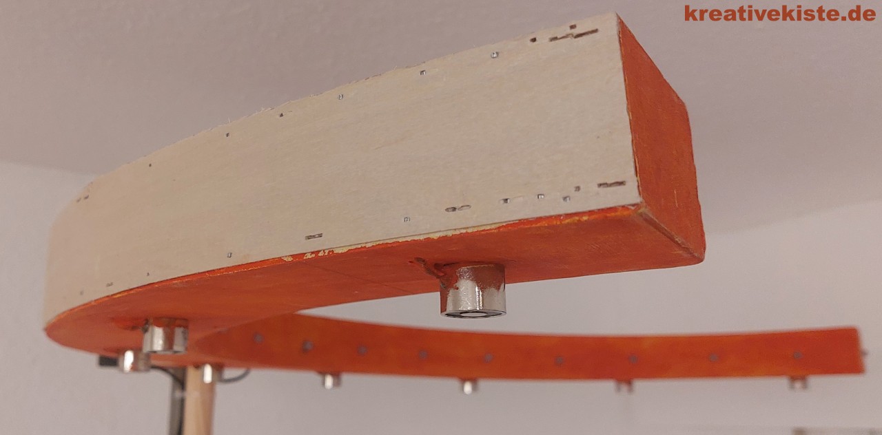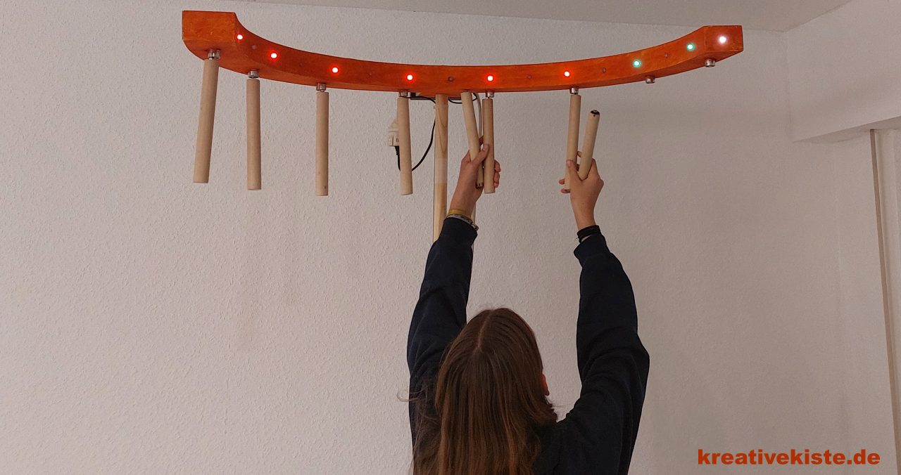- Hänge die acht Stäbe senkrecht an die Magneten (LED rot = Magnet aus, LED grün = Magnet an).