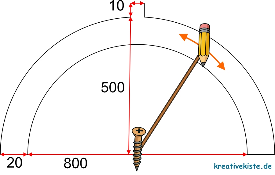 Zwei Halbkreise mit den Massen auf das 10mm Holz übertragen und aussägen. Mit einer Schnur, die an einer Schraube befestigt ist und einem Stift der am anderen der Schnur befestigt ist, bekommst du einen ganz guten Halbkreis hin. Alle Angaben in Millimeter