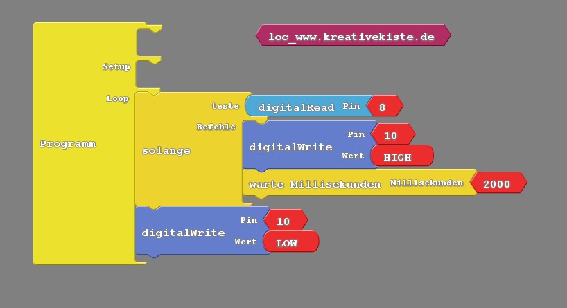 Der Taster am Pin 9 mit einem so genannten Pulldown Widerstand angeschlossen. Mit dem Programm untern, wird die LED mit einem Druck auf den Taster eingeschaltet.