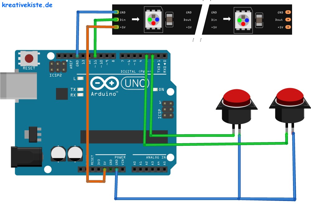 Beim LED-Rennen treten zwei Spieler gegeneinander an. Jeder steuert einen eigenen Lichtpunkt, der über eine Reihe von LEDs läuft. Mit jedem Tastendruck rückt die LED des Spielers ein Stück weiter Richtung Ziel. Wer seine LED zuerst bis ans Ende der Reihe bringt, gewinnt das Rennen!