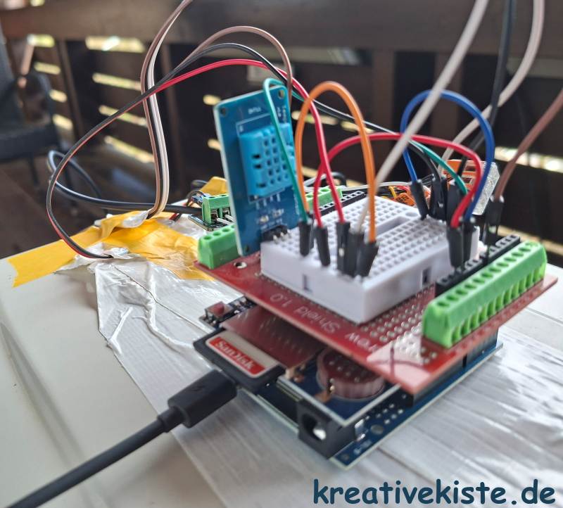 Der Versuchsaufbau war nur durch eine Plastikkiste Geschütz, da das Gerät unter einem großen Vordach steht. Wird das Tool zur ständigen Überwachung einer Klimaanlage verwendet, muss das ganze natürlich vernünftig eingebaut und verdrahtet werden.