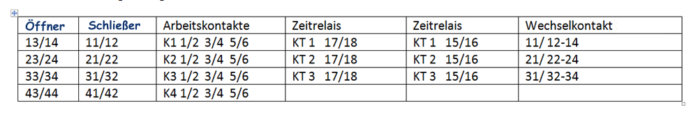 Wie in der Zeichnung zu erkennen, gibt es zwei Arten von Kontakten: ÖFFNER und SCHLIEßER. Die Schließerkontakte schließen den Stromkreis, wenn der Schütz anzieht. Die Öffnerkontakte unterbrechen, bzw. öffnen die Kontakte, wenn der Schütz anzieht. Wie in der Skizze oben dargestellt, werden die Kontakte entweder geöffnet oder geschlossen und damit die Schaltungen ausgeführt. Hier ein kleiner Auszug der fortlaufenden Nummerierung von Schützkontakten.