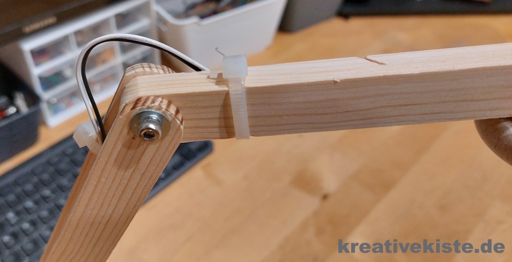 Zum Schluss das Holzrad mit dem LED von unten festschrauben und das Kabel nach unten zum Fuß legen.