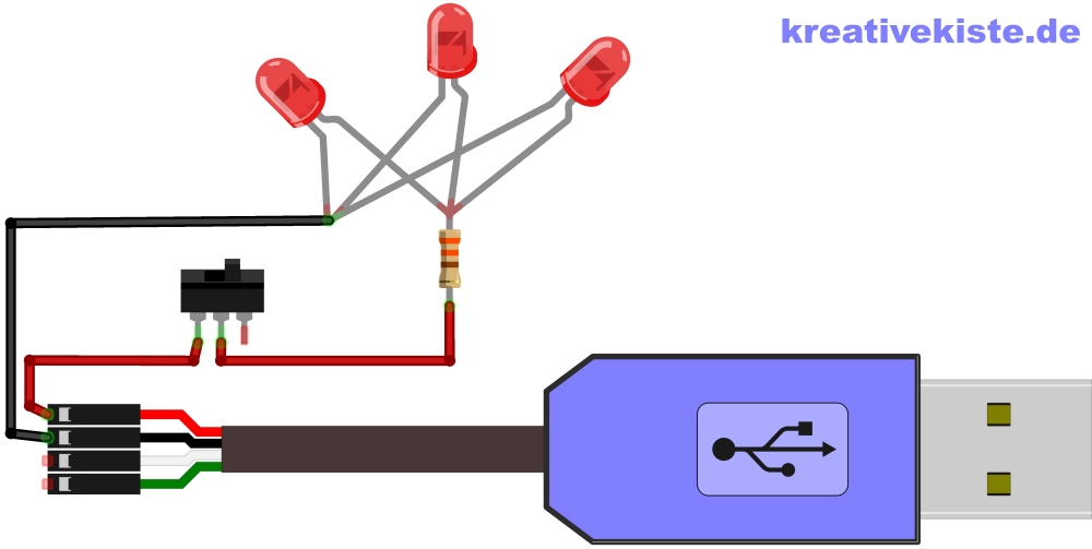 Die Schaltung besteht nur aus drei LED (hier rot, weil weiß schlecht zu sehen ist). Die mit einem 330Ohm Widerstand und einem Schalter mit der Batterie verbunden werden. Beim USB Kabel habe ich vorne den Stecker abgezwickt und mit dann an den GND bzw. den Schalter gelötet.