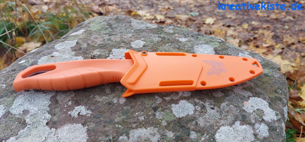 Im praktischen Einsatz schneidet das BM 18040 zuverlässig und bleibt erstaunlich scharf. Nach mehreren Einsätzen im Salzwasser, Süsswasser und beim Campen zeigt sich keine Spur von Rost – ein klares Zeichen für gute Korrosionsbeständigkeit. Ich spüle das Messer nach jedem Gebrauch kurz mit Wasser ab und trockne es, mehr ist bisher nicht nötig gewesen.