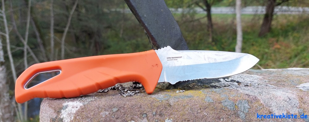 Schon beim Auspacken vermittelt das Messer einen robusten Eindruck. Die Stonewashed-Klinge wirkt hochwertig und verzeiht auch mal Kratzer oder Salzrückstände, ohne gleich unschön auszusehen. Die Kombiklinge mit glatter Schneide und Wellenschliff ist in der Praxis sehr vielseitig. Feine Schnitte, wie beim Zurechtschneiden von Leinen oder Fischschnüren, gelingen ebenso gut wie das Durchtrennen von dickeren Seilen oder Gurten.