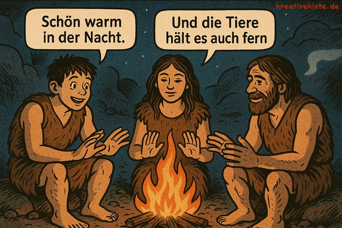 - Offenes Feuer (ca. 500.000 v. Chr.): Erste Menschen wärmten sich an offenen Feuerstellen in Höhlen und Hütten. Das Feuer diente zugleich zum Kochen und Schützen.