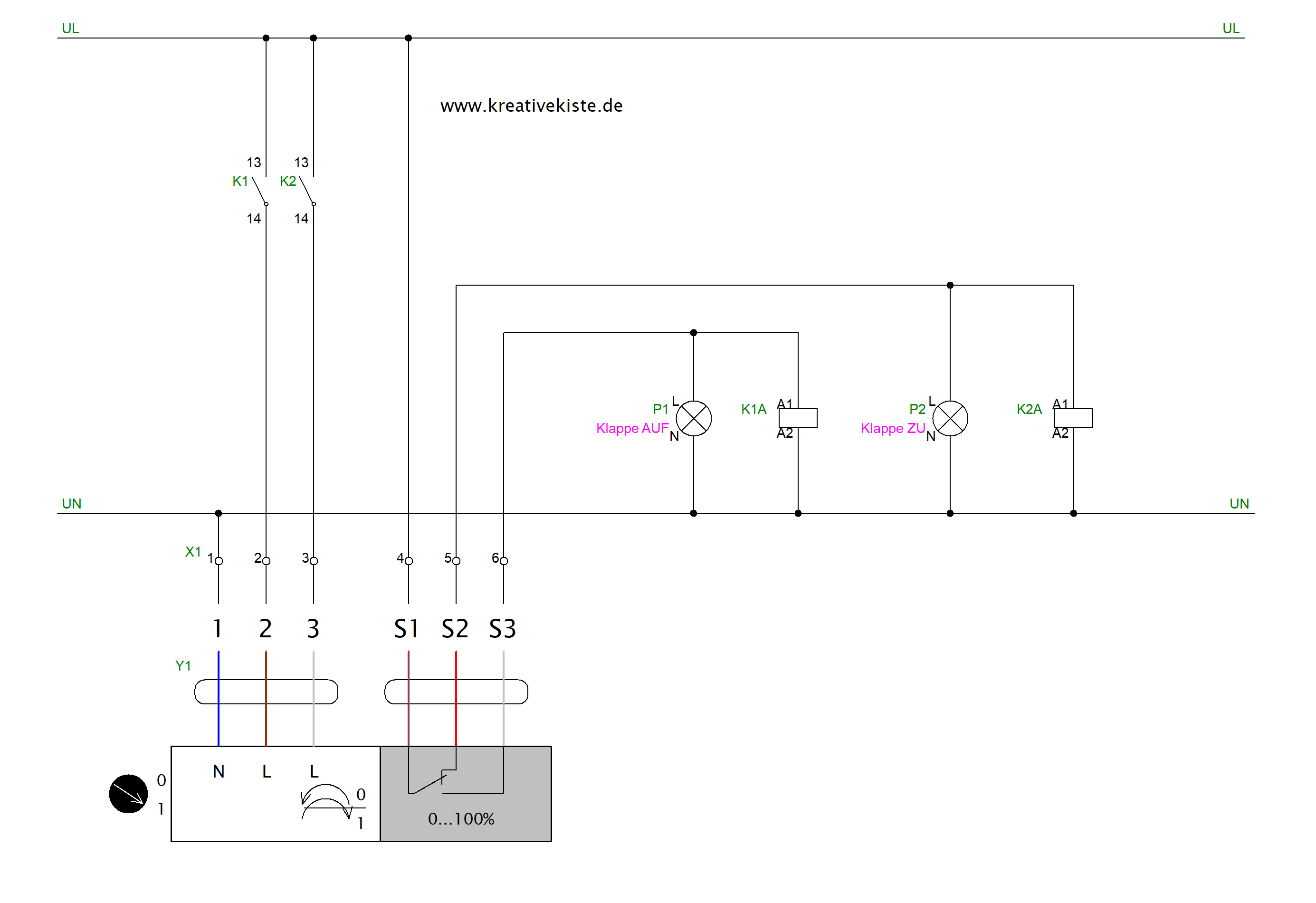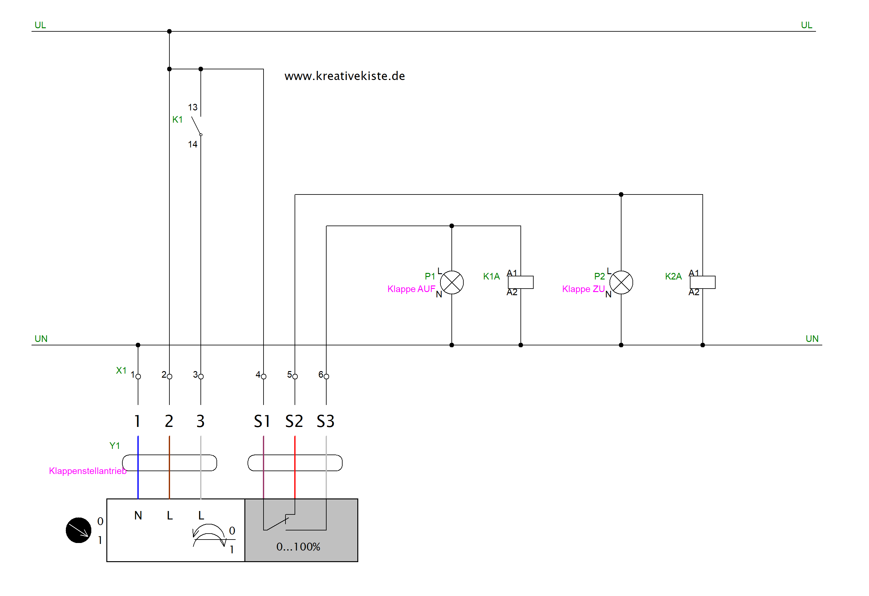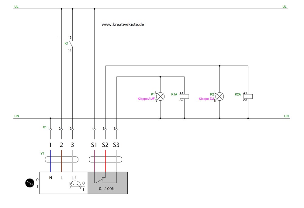 Der Antrieb kennt nur zwei Zustände: AUF oder ZU. Bei Ansteuerung öffnet die Klappe, bei Spannungsabfall am Schaltkontakt schließt sie Motorisch automatisch wenn an L und N Spannung anliegt.