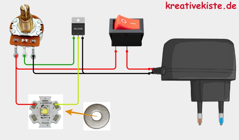 🚨Achtung bei dieser Schaltung wird vor allem die LED sehr warm/heiß, deshalb muss das LED Modul einen Kühlkörper bekommen. Dazu am besten eine große Unterlegscheibe zwischen Holz und LED verbauen.