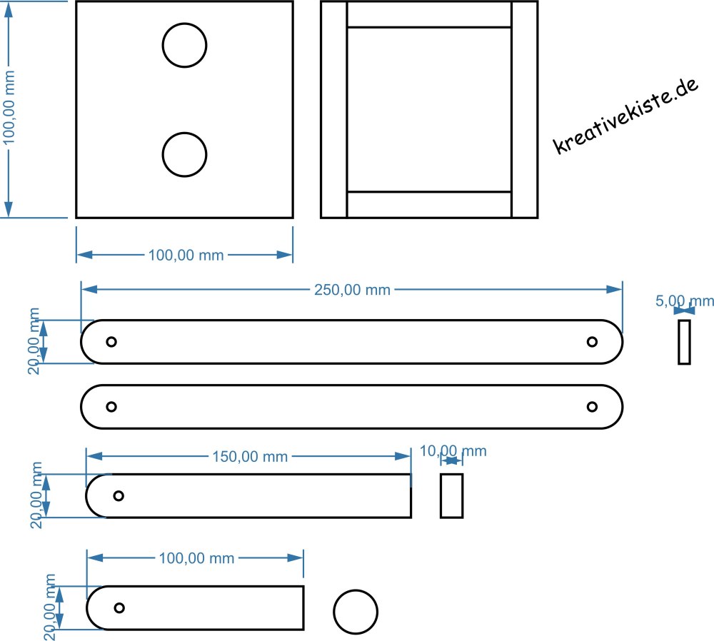 Hier die von mir verwendeten Maße, nur die Montageplatte habe ich nachträglich noch geändert.