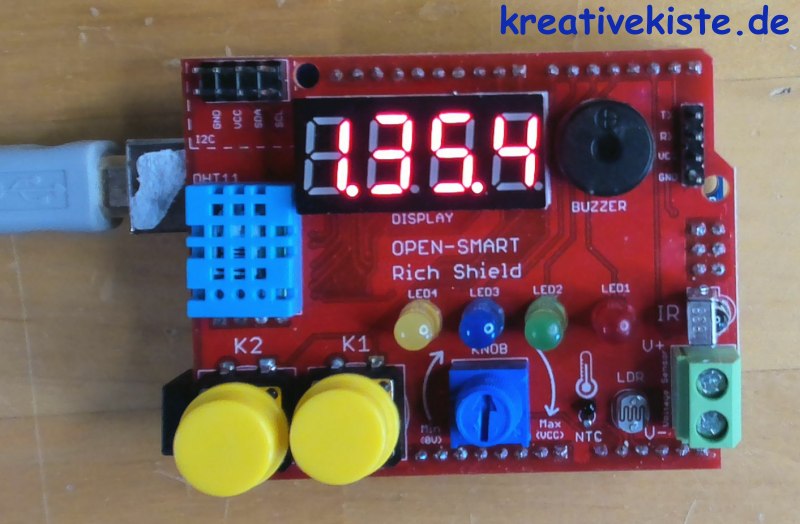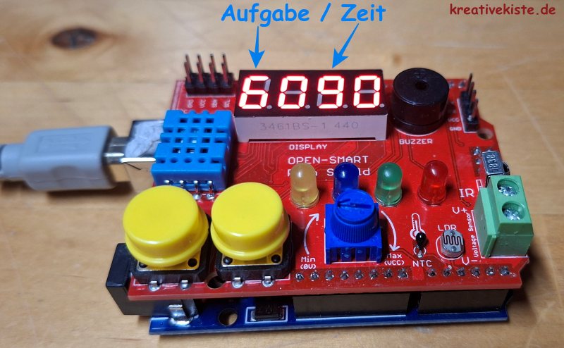 - Eieruhr mit Alarm: Poti stellt die Minuten ein, Display zählt runter, Buzzer meldet "Fertig".