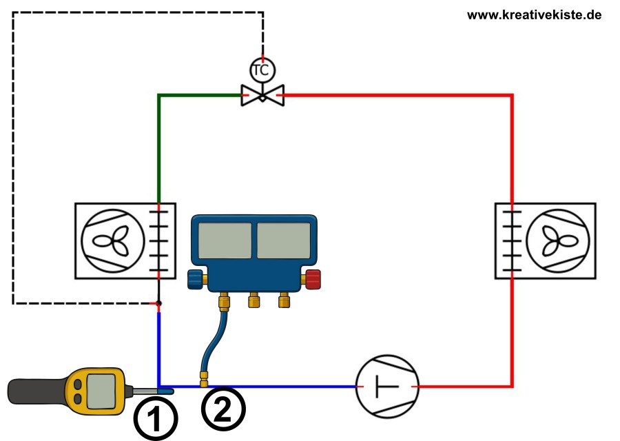 - Saugleitung Oberfläche (Saugrohrtemperatur) messen am Verdampferaustritt (Fühler sauber anlegen und ggf. isolieren).