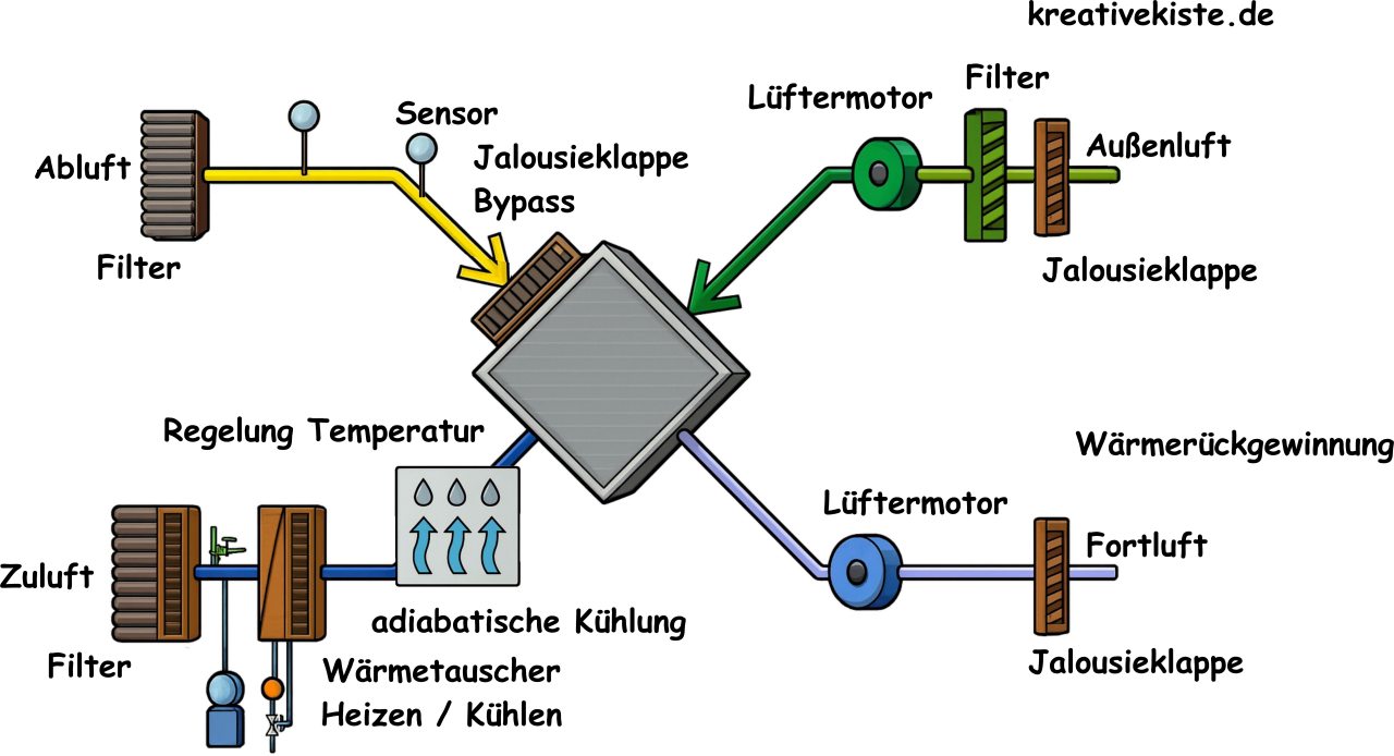 - Wasser wird in den Abluftstrom eingesprüht, der dann über einen Wärmetauscher (z. B. Plattenwärmetauscher (Kreuzstrom) oder Rotationswärmeübertrager) Wärme aus der Zuluft entzieht.