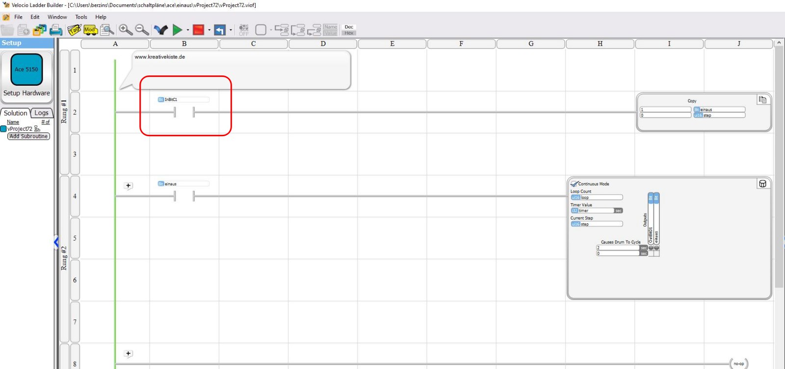 Über Copy wird die Variable "einaus" auf 1 und die Variable "step" auf 0 gesetzt.