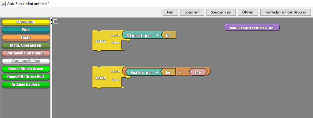 Anstatt eines "digitalen pin" nach dem "teste" wird die Bedingungen "wahr wenn der erste Werte größer ist als der zweite" verwendet. Ist der Taster nicht gedrückt und wird ein "pull-down" Widerstand verwendet dann ist der Wert "0", wird der Taster gedrückt ist der Wert größer als "1000", vermutlich wird er genau 1023 haben, also 4,9999 Volt. Damit ist der erste Wert größer als der zweite und die Bedingungen erfüllt. Der "falls" Block wird ausgeführt wie bei einem digitalen Eingang.