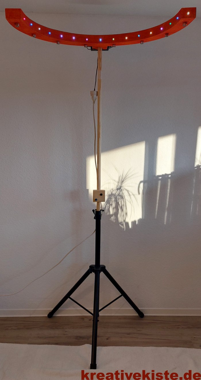 Nachdem sicher ist das alles funktioniert wird mit Schrauben, nicht mir Leim, der Teil hinter der Schaltung geschlossen. Nun kann der Besenstiel in das Spiel geleimt werden (ggf. vorher an den Stellen wo nicht geleimt wird Lackieren). Der Besenstiel wird nun mit dem Boxenstativ verschraubt. Bevor du spielen kannst musst du noch 8 Spielhölzer absägen und eine M6 oder M8 Schraube in das Holz drehen.