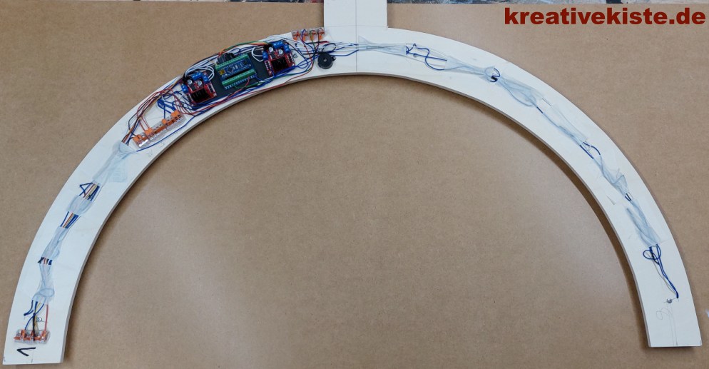 Nun die Schaltung auf dem unteren Brett aufbauen und testen. Später kommst du an die Schaltung durch eine Öffnung an der Rückseite noch hin aber jetzt ist es leichter einen Fehler zu finden und zu beheben.
