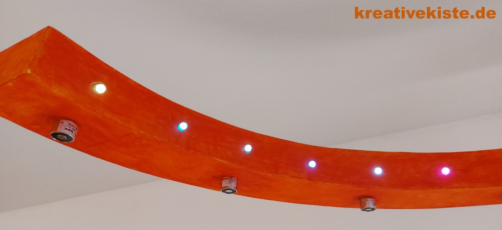 Nur die Stelle hinter der Schaltung bleibt frei. Nach dem schleifen und lackieren werden die LEDs eingesetzt und die ganze Schaltung noch einmal getestet.