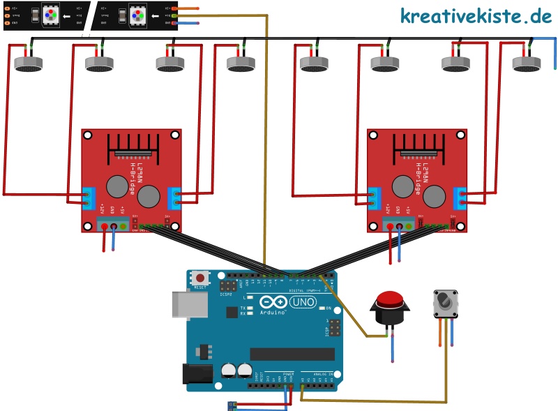 Bei der Schaltung habe ich mich für zwei H-Brücke L298N entschieden, weil diese im Gegensatz zu Relais, geräuschlos sind, keine Spannungsspitzen haben, kaum Strom verbrauchen und nicht jeder Kontakt extra verdrahtet werden muss. Mit 2 H-Brücken kann ich 8 Magnete ansteuern, was völlig ausreichend ist. Das LED Band ist ein DC5Volt WS2812B. Die LEDs haben einen WS2812 Chip, können also wie NEOPixel programmiert werden. Die Spannungsversorgung der NEO Pixel kann etnweder vom Arduino, von einer der H-Brücken (5 Volt Ausgang) oder einem externen Netzteil erfolgen. Der Übersicht wegen habe ich die Kabel der Spannungsversorgung nur angedeutet.