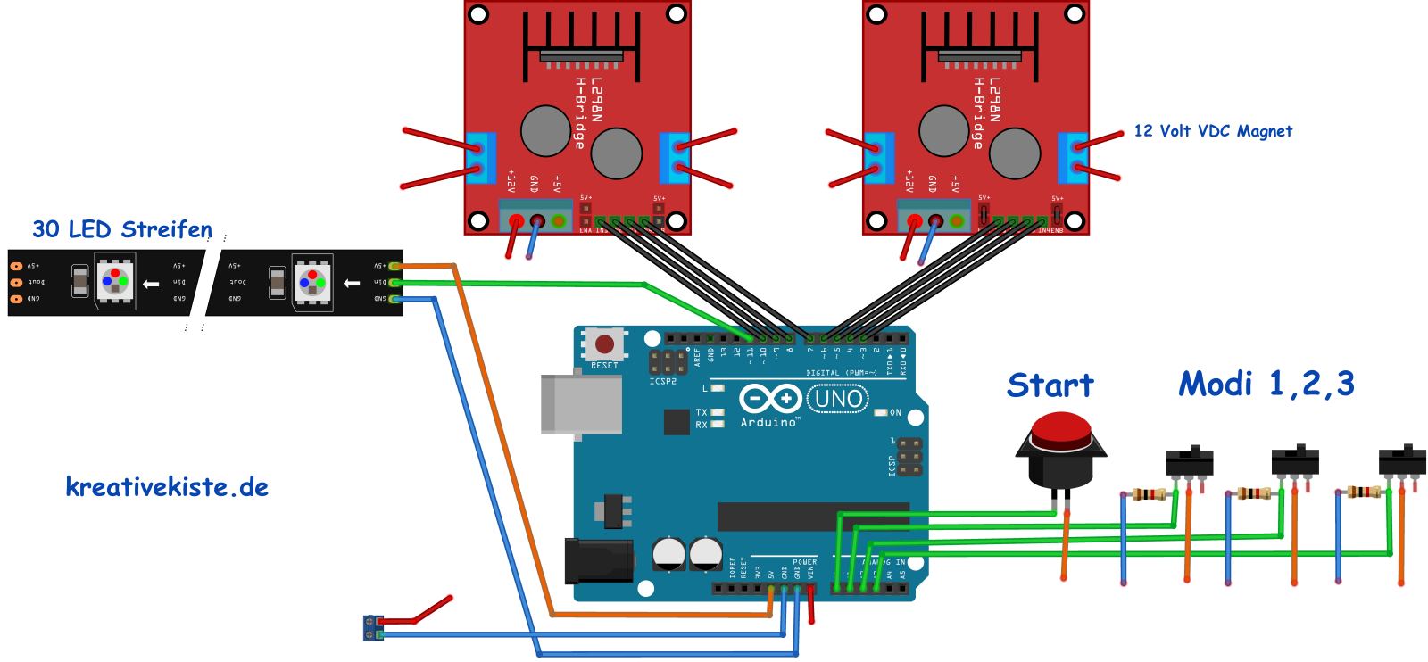 Bei der Schaltung habe ich mich für zwei H-Brücke L298N entschieden, weil diese im Gegensatz zu Relais 2 Vorteile haben. 1, das klicken der Relais ist zu deutlich vor dem lösen des Magnetes zu hören, damit hat der Spieler einen zeitlichen Vorteil. 2, die L298N, verbraucht kaum Leistung des Arduino. 8 Relaisspulen "ziehen" einiges an Strom. Deshalb also H-Brücken und keine Relais. Mit 2 H-Brücken kann ich 8 Magnete ansteuern, was völlig ausreichend ist. Der Übersicht wegen habe ich die Kabel der Spannungsversorgung nur angedeutet.