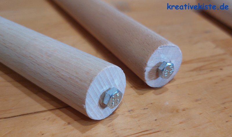 In die Hölzer sind M6 schrauben geschraubt. Dazu ein 4,5mm Loch bohren und die Schrauben ohne Dübel oder Kleber in das Holz schrauben.