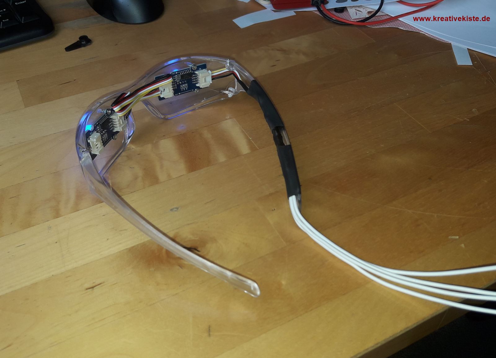Eine alte Schutzbrille war schnell gefunden und aus meiner Kiste mit den Grove SEEED Bauteilen haben wir dann zwei RGB LED Module genommen. Die SEEED RGB LED Module haben den Vorteile dass über 4 Kabel zwei 10mm LEDs in der Farbe und Helligkeit geregelt werden können. Den Stecker haben wir abgeschnitten und dann mit 4 Kabel verlängert. Damit das ganze auch gut hält sind Schrumpfschläuche zum Einsatz gekommen.