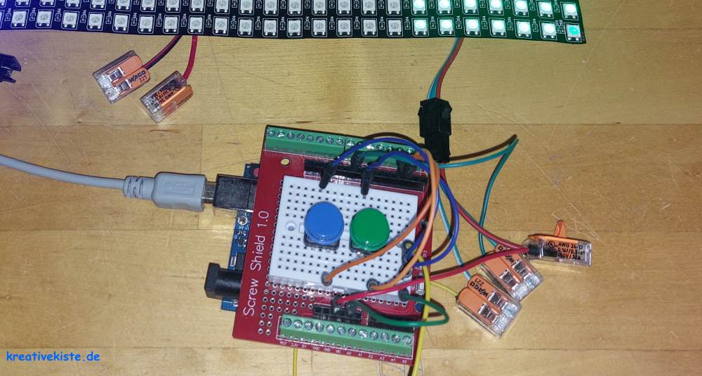 Die Schaltung besteht nur aus einem Arduino, zwei Tastern und einer 255 LED Matrix.
