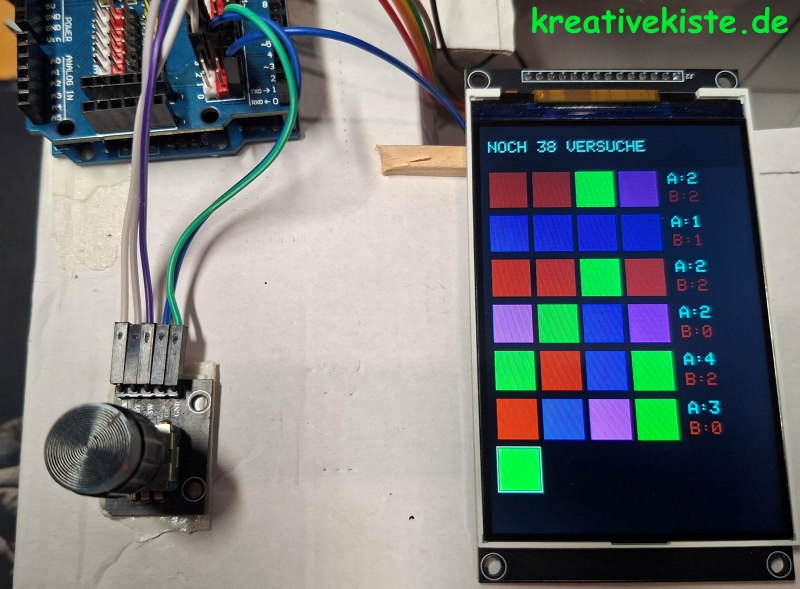 - Phase 2 – Das Raten: Spieler 2 versucht nun sein Glück. Durch Drehen am Encoder wählt er eine Farbe, ein kurzer Druck auf den Button bestätigt die Wahl für die aktuelle Position.