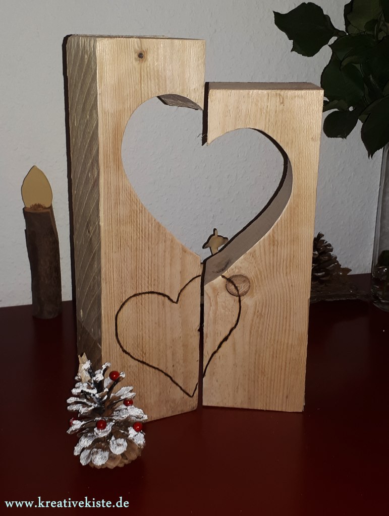 Die zwei halbe Herzen die aus den Holzbalken ausgesägte sind, habe ich mit einer Schnurr verbunden und vor die Balkenherzen gestellt. Dass die Herzen aus dem Balken nicht kaputt gehen, klappt natürlich nicht immer, ja nach Radius bzw. stärke des Sägeblattes muss man auf zwei mal sägen.