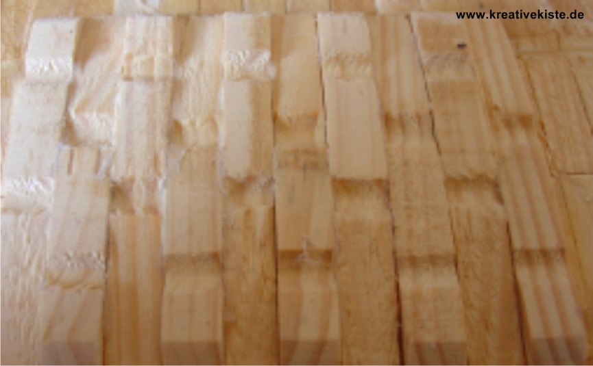 22 Wäscheklammern voneinander trennen und die Metallfedern in der Mitte entfernen. Danach zwei Reihen mit je 17 halben Wäscheklammern aneinander leimen, nach dem trocknen des Leims so lange abschleifen bis die Wäscheklammern eine gerade und schöne Fläche bilden.