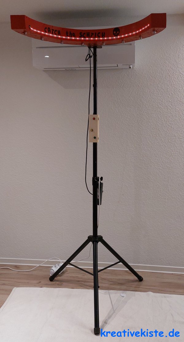 Auch hier habe ich wieder ein Lautsprecher-Stativ verwendet. In das Rohr habe ich den Stiel von einem Rechen gesteckt und festgeschraubt. Die Taster sind in einem kleinen Holzgehäuse verbaut. Die Schwierigkeitsstufe muss nicht ausgewählt werden, sondern wird nach dem Ampelprinzip durch drücken ausgewählt. Grün - einfach, gelb - mittel, rot - schwer.