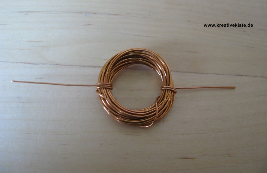 Wenn ihr die 1,50 oder 2 Meter Kupferlack Draht so zu einer Spule gewickelt habt, zieht ihr die Spule von dem Rundholz und wickelt beide losen Enden zwei bis drei mal um die Spule, so dass der Draht nach außen schaut.