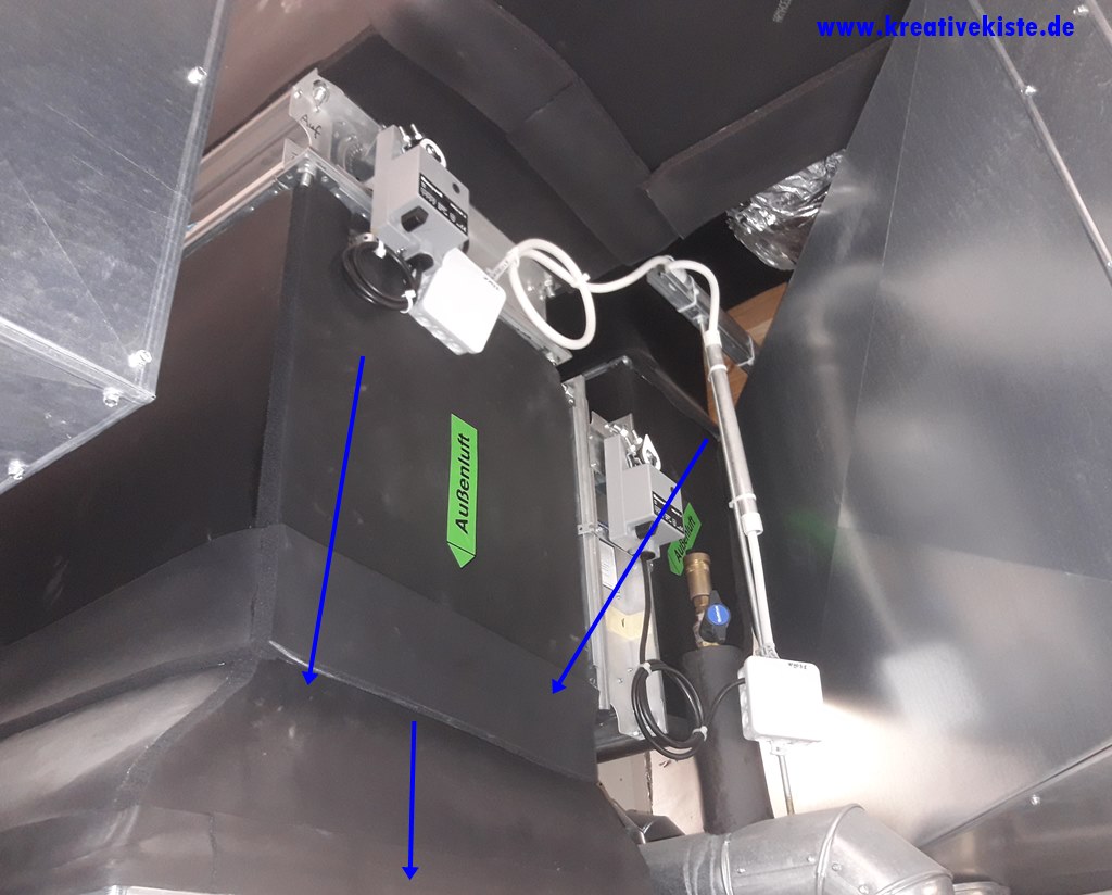 Hier sieht man die zwei Lüftungskanäle, links der Kanal der durch die Erde geht und rechts der Kanal der die Luft direkt über dem Dach ansaugt. Die Umschaltung geschieht lediglich durch die beiden Jalousieklappen.