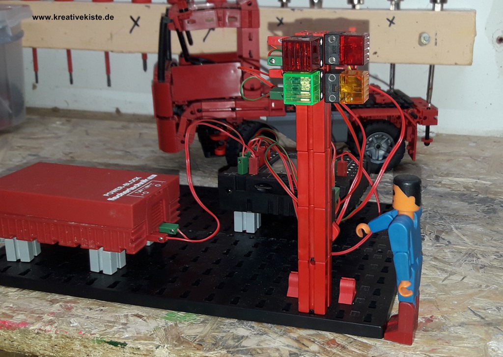 Mein Sohn wollte was mit Kabel, Strom, Batterie usw. bauen. Da ich keine Lust hatte mir etwas auszudenken und auf Reißnägeln zu löten. Haben wir eine einfache Fußgängerampel mit Fischertechnik gebaut.