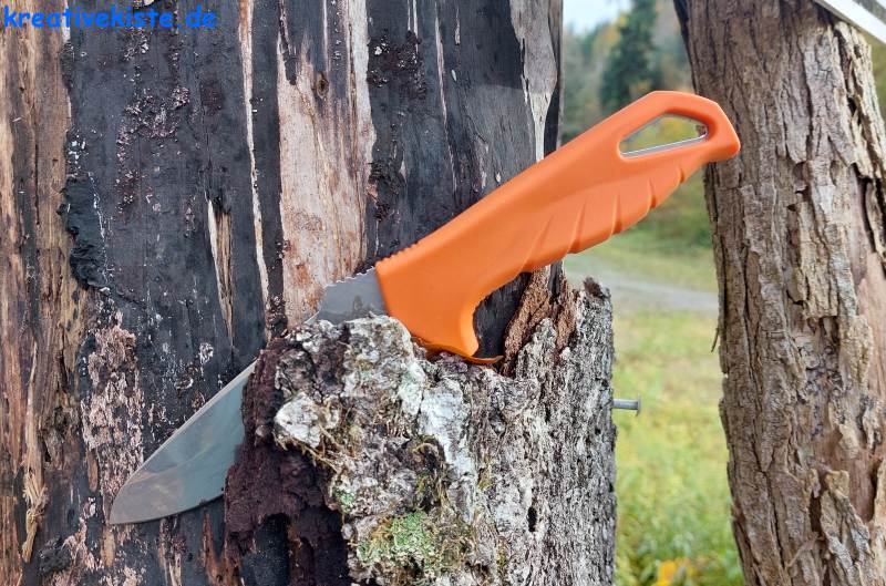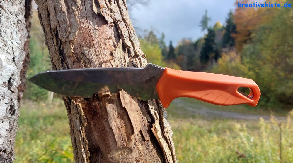 Besonders überzeugt hat mich der orangefarbene Santopren-Griff. Er liegt ergonomisch und sehr sicher in der Hand auch mit nassen Händen oder Neoprenhandschuhen. Das leicht gummierte Material bietet eine hervorragende Rutschfestigkeit und ein angenehmes Griffgefühl. Durch die auffällige Farbe lässt sich das Messer auch im Wasser oder auf dem Bootsdeck sofort wiederfinden, falls es einmal herunterfällt. Das ist im Alltag tatsächlich ein echter Vorteil, den ich nicht mehr missen möchte.