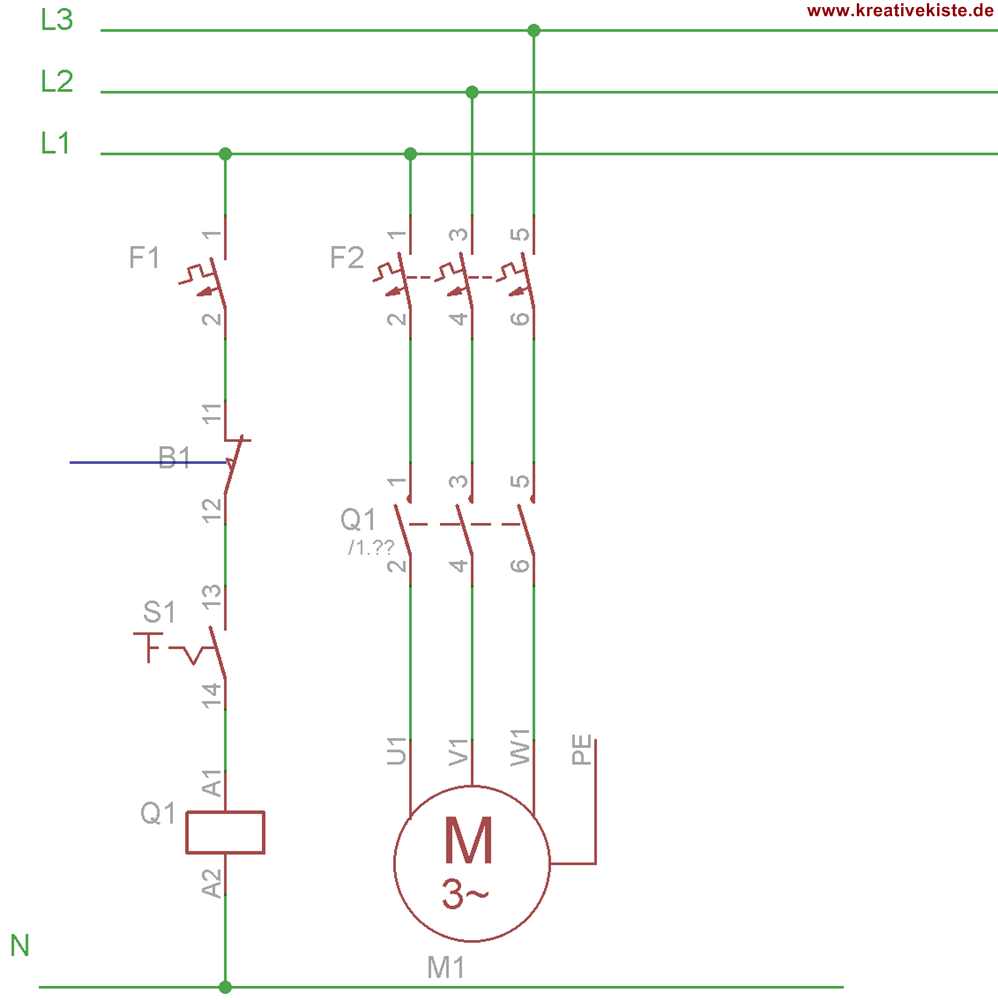 Das Tolle an Schützen ist ja, dass sie mehrere Kontakte auf einmal schalten können. Zum Beispiel kann ein Drehstrommotor mit 3 Phasen ein- und ausgeschaltet werden.