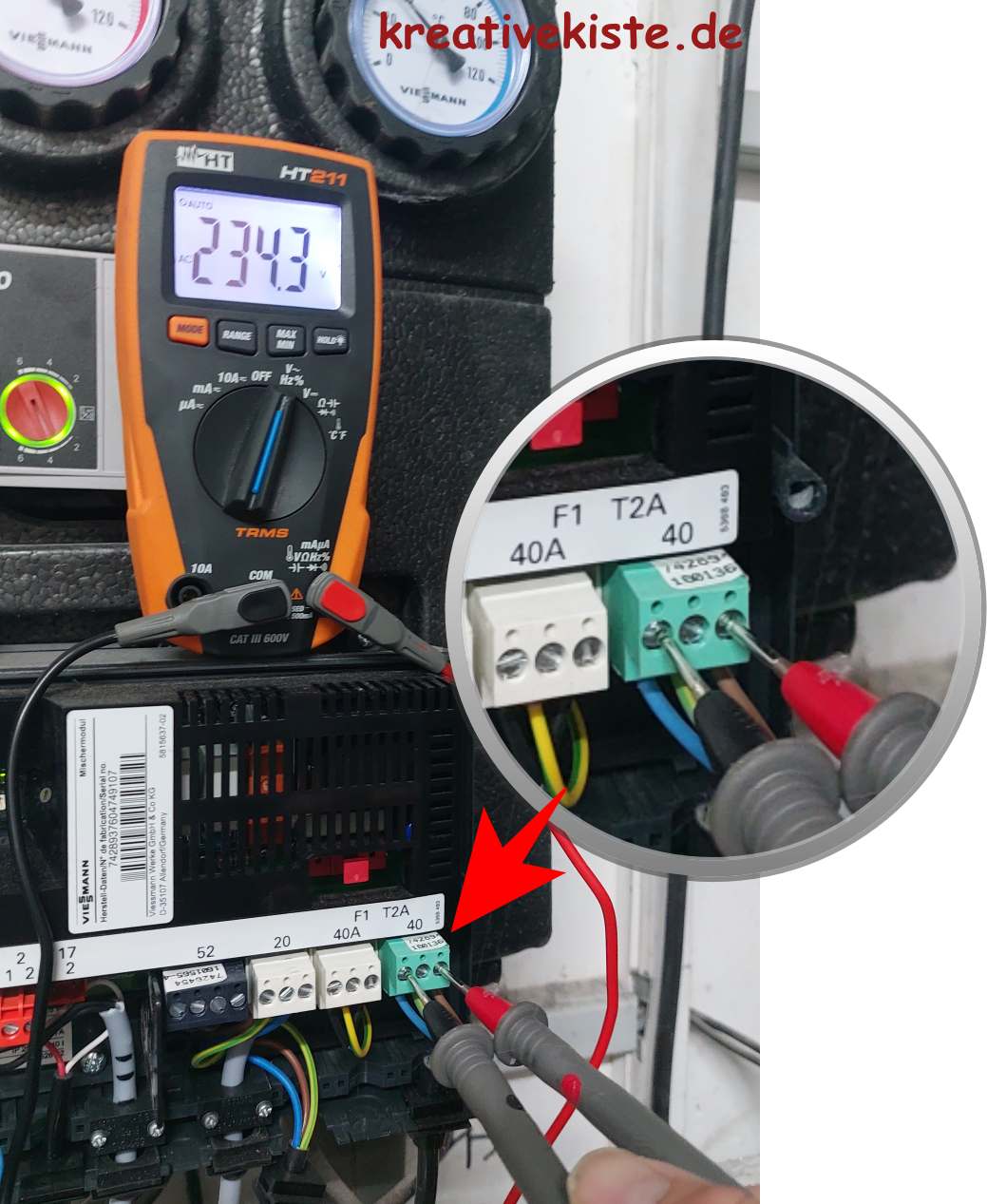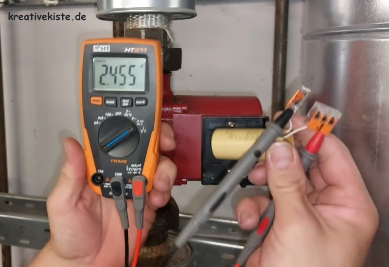 - Bei eingeschalteter Pumpe solltest du 230 V~ messen.