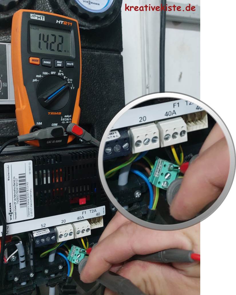 - Kondensator abklemmen und zwischen beiden Kabeln messen.