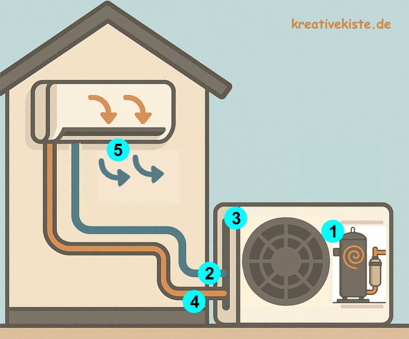 Um eine verlässliche Diagnose zu erhalten, misst du die Temperaturen entlang des Kältemittelkreislaufs, wobei du am Punkt 1 direkt am Austritt des Verdichters im Außengerät startest, um die thermische Belastung des Kompressors (Heißgas) zu bestimmen. Dein Weg führt dich weiter zur Saugleitung am Punkt 2, wo du die Temperatur des aus dem Haus zurückkehrenden Gases misst, bevor du am Punkt 3 der im Schema den Verflüssiger-Ausgang markiert kontrollierst, wie effektiv die Wärme an die Außenwelt abgegeben wurde. Die eigentliche Kühlleistung bereitest du durch die Messung der Einspritztemperatur am Punkt 4 hinter dem Expansionsorgan vor und findest deinen Abschluss am Punkt 5 im Innenraum, wo die tatsächliche Luftausblastemperatur den Erfolg des gesamten Prozesses für dich messbar macht. Wichtig sind vor allem Punkt 1, Punkt 2 und Punkt 5. Die Punkte 3 und 4 kannst du in aller Regel vernachlässigen. Verwende für die Messung an den Rohren am besten ein Temperaturmessgerät mit Anlegefühler.