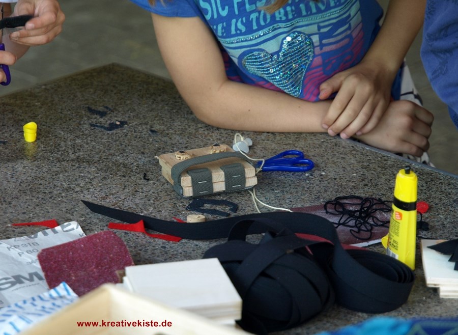Auf der Oberseite (4 Finger) zwei Stoffstreifen und auf der Unterseite (Daumen) einen Stoffstreifen mit Tackerklammern befestigen. Eine Holzkugel an einem Lederband befestigen und mit einem 3 mm Rundholz in dem Holz befestigen. Alternativ das Lederband auch tackern.