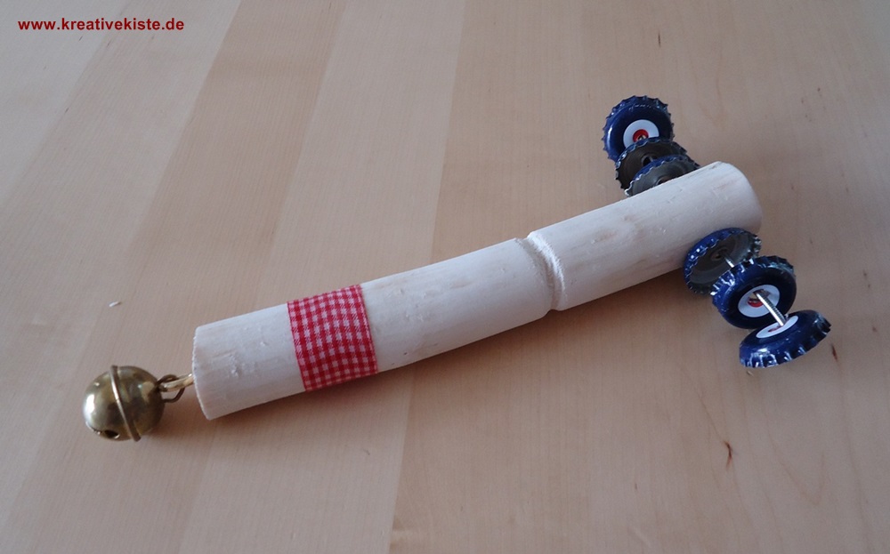 Für kleine Kinder ist das ein echt tolles Spielzeug. In die Kronkorken der Bionade (oder anderen Kronkorken) werden mit einem großen Nagel und einem Hammer Löcher geschlagen. Die Kronkorken werden dann auf einen kleineren Nagel aufgefädelt und in ein Holz geschlagen (bitte vorbohren, sonst reißt das Holz). Als Holz kann ein geschnitzter Ast oder ein Rundholz verwendet werden. Wer möchte, kann noch eine Glocke, ein Band, eine Kerbe oder ähnliches anbringen. Viel Spaß beim Trinken und dann auch beim Basteln.