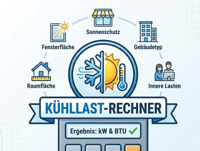 ⚖️ Wichtiger Hinweis zu den Berechnungsergebnissen Die mit diesem Kühllast-Rechner ermittelten Werte dienen der unverbindlichen Orientierung und basieren auf vereinfachten physikalischen Annahmen. Bitte beachte, dass dieses Tool eine detaillierte Fachplanung nach VDI 2078 (bzw. DIN EN 12831-3) nicht ersetzen kann. Faktoren wie spezifische Wärmespeichermassen des Mauerwerks, instationäre Wärmeströme oder komplexe Verschattungs-Szenarien werden hier nur überschlägig erfasst. Für die Richtigkeit der Ergebnisse und daraus resultierende Kaufentscheidungen wird keine Haftung übernommen. Wir empfehlen vor der Installation immer die Abstimmung mit einem Fachbetrieb.