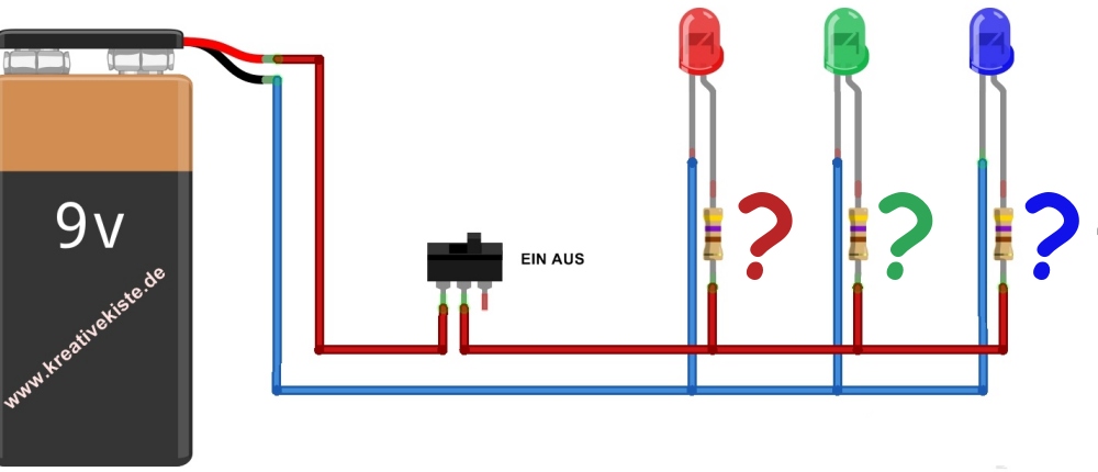Du möchtest eine rote, eine grüne und eine blaue LED an derselben Batterie betreiben? Hier musst du aufpassen, denn Farben mischen ist trickreich!