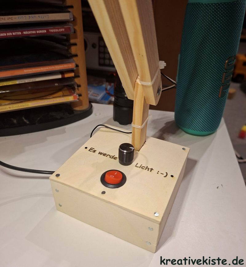 Doch zuerst einmal sind deine handwerklichen Fähigkeiten gefragt. Du musst die Holzteile passgenau sägen, bohren und mit Schrauben zum stabilen Gelenkarm zusammenbauen. Wenn das Grundgerüst steht, baust du die Elektronik und die LED ein.