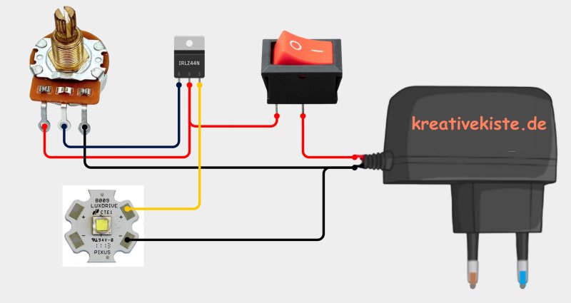 - Das Netzteil (Stromquelle): Es verwandelt die hohe Spannung aus deiner Steckdose in eine kleine, für uns nutzbare Spannung, die für die Bauteile sicher ist. Ohne das Netzteil würde die LED sofort durchbrennen.