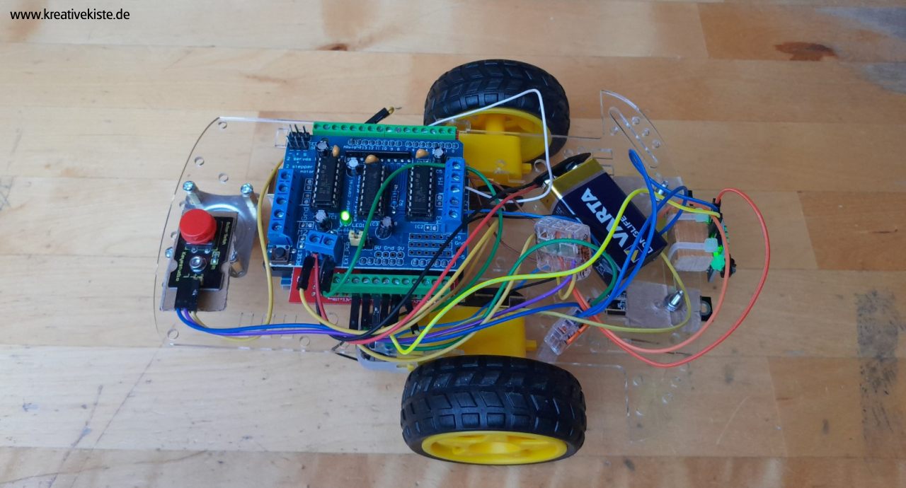 Mit einem 2WD Chassis, einem Arduino und Ardublock lässt sich ein ganz einfach Auto bauen dass Hindernisse erkennt und dann weiterfährt. Als erstes soll es nur darum gehen mit dem 2WD Chassis vorwärts zu fahren und wenn ein Hindernis erkannt wird soll das Fahrzeug umdrehen und dann weiterfahren. Natürlich hat dies keinen praktischen nutzen aber es soll ja nur darum gehen sich mit dem Fahrzeug vertraut zu machen.