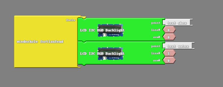 Das seeedstudio grove lcd rgb Display hat den einen großen Vorteil dass es in Ardublock einen "Block" dafür gibt, er super funktioniert. Darüber hinaus kommt das Display fertig verdrahtet für den I2C, hat 2 Reihen, 10 Zeilen, ein RBG beleuchtetes Display und das Ganze für 15 Euro.