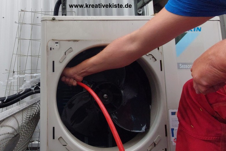 Den Wärmetauscher des Außengerätes mit Wasser reinigen. Ist der Wärmetauscher sehr stark kannst du auch das Gitter abbauen und von innen nach außen reinigen. (Dazu die Sicherung des Geräts raus machen).